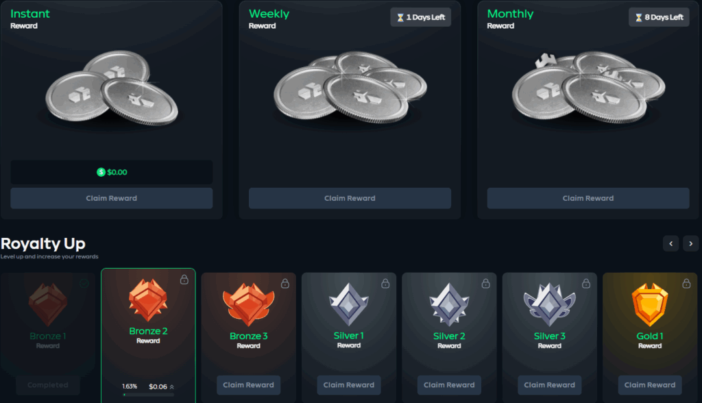 Gamdom Royalty Club (VIP): A multi-tiered loyalty program with 24 levels across eight tiers, offering personalized rewards, level-up bonuses, and tailored promotions.