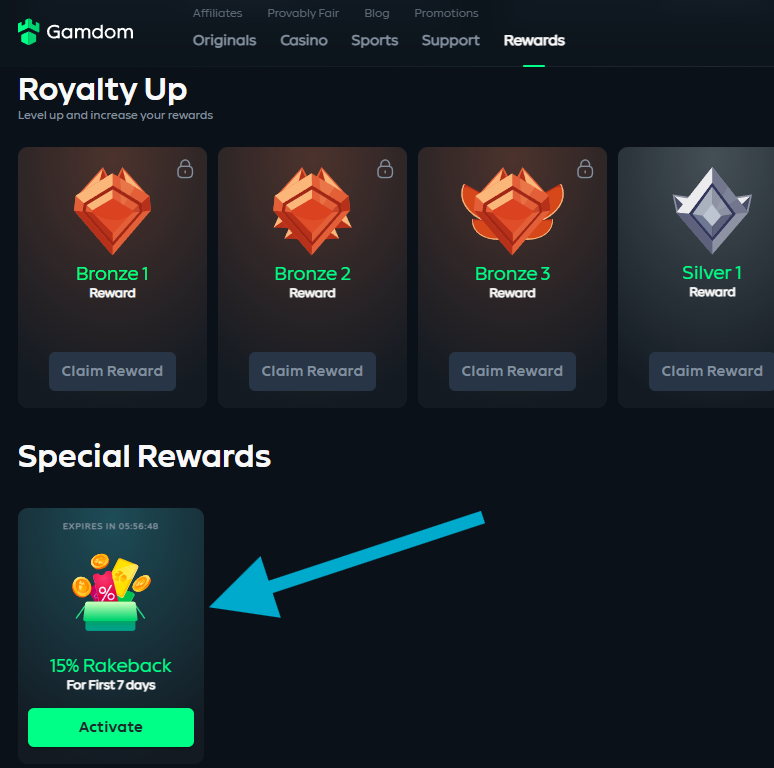 Welcome Rakeback: New users can claim a 15% Rakeback on all wagers for the first 7 days, often activated with a promo code Gamdom.com.